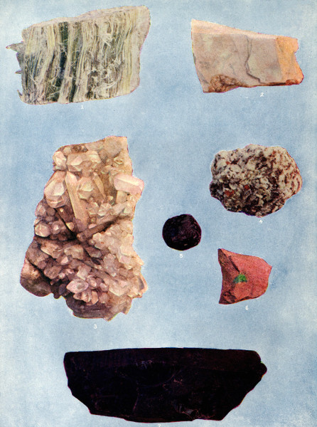The minerals already mentioned, quartz, feldspar, and mica, are the components of a large part of our granites. In the case of the red Scotch granite, another silicate, hornblende, replaces the mica. Various silicates of economic value are asbestos, a variety of hornblende, and augite, which are silicates of magnesium and iron or calcium; and talc, which is a silicate of magnesium containing water. A great number of gems are found among the silicates, including tourmaline, garnet, topaz, beryl, and chrysolite.