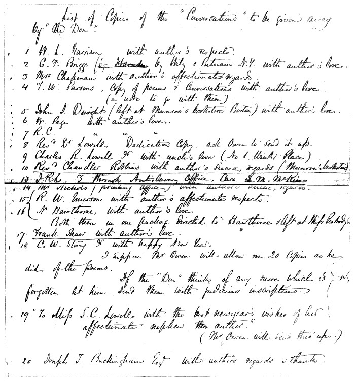 | Facsimile of Lowell’s List of Friends to whom he presented copies of Conversations on the Old Poets. “The Don” was Robert Carter | facing 92 |