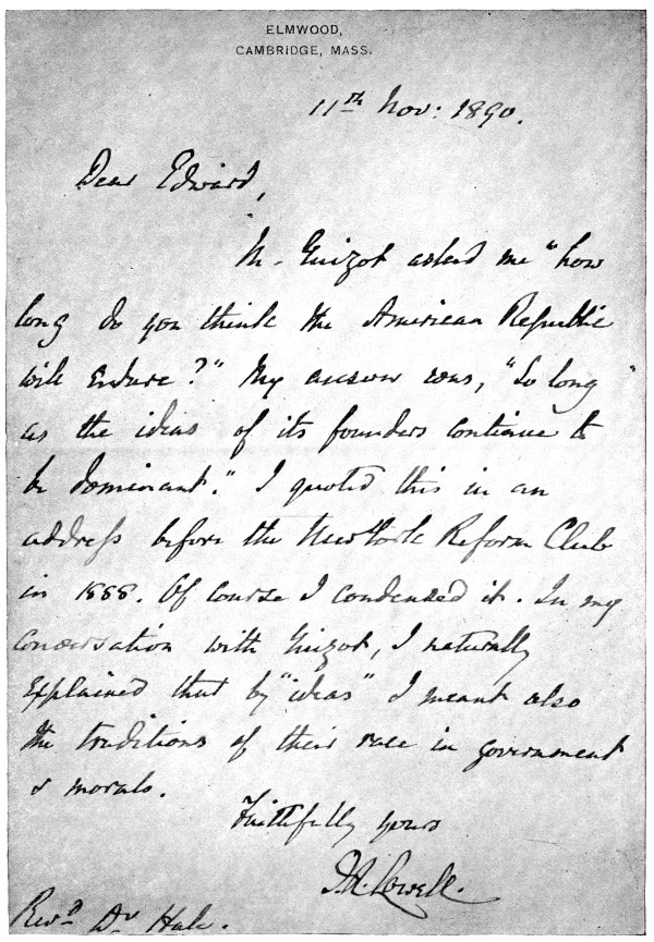 I remember that on the first visit I made him after he was reëstablished at Elmwood, when I congratulated him because he was at home again, he said, with a smile still, “Yes, it is very nice to be here; but the old house is full of ghosts.” Of course it was. His father and mother were no longer living; Mrs. Burnett, who was with him there, was the only one of his children who had survived; and the circle of his brothers and sisters had been sadly diminished. He and his brother, Robert Lowell, died in the same year. Still, he was here with his own books; he had the old college library under his lee, and he had old friends close at hand. Once or twice in his letters of those days he goes into some review of his own literary endeavor. Certainly he had reason to be proud of it. Certainly he was not too proud; and I think he did have a feeling of satisfaction that his neighbors and his country appreciated the motive with which he had worked and the real success which he had attained.