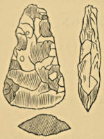 Spear-heads.—The greater part of these belong to the later period, and are remarkable for the care and attention which has been bestowed upon their construction. They invariably present a lance-like outline of symmetrical proportions with the edge in one plane, and are chipped so as to be very thin (Fig. 5); at times notches occur upon either side to facilitate their fixing into the end of the spear shaft and being bound firmly in it. Others have been found with the cutting edge carefully ground and polished, but with the tang only chipped and the edges serrated to afford a firm grip for the sinews used to affix it to the shaft. They vary in length from three to ten or more inches.