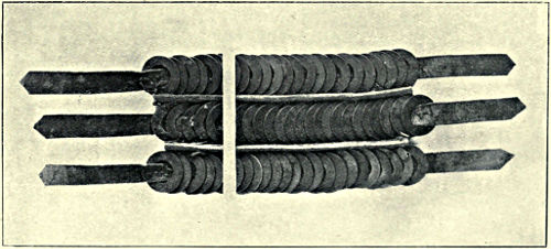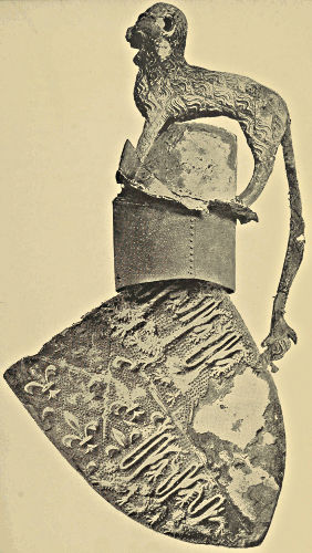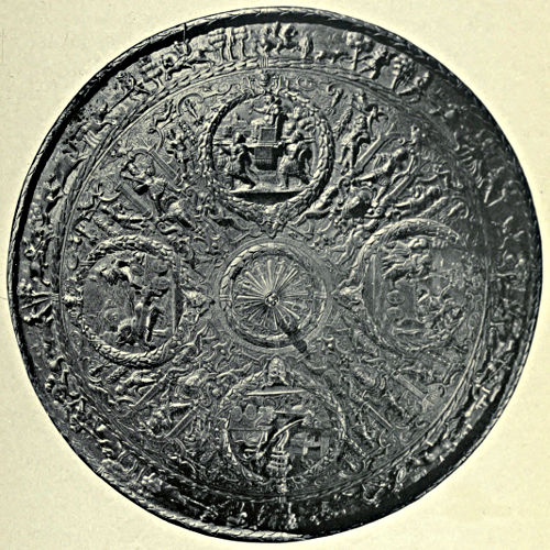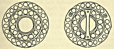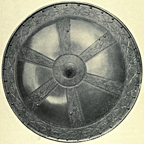 Shields.—Among primitive races the shield was invariably of wicker-work or of wood, and as the examples in bronze which have been unearthed are of a high order of skill in workmanship and design we may naturally infer that they were of comparatively late introduction, and only appeared when the expert artizan of the age was capable of producing plates of considerable area and of uniform thickness. In the British Museum are several very fine examples of shields, one of which we illustrate to show the general form and shape (Fig. 29). It was dug up not far[Pg 18] from the river Isis, in the vicinity of the Dyke Hills, near Dorchester in Oxfordshire. It is circular in form, about 13 inches in diameter, and ornamented with two concentric rings of bosses which encircle an umbo. All these bosses have been repousséd in the metal except four, which are used in two instances as rivet heads to fix the handle in position, and in two others to fasten buttons to the interior of the outer rim. It is probable that a guige was fastened to these buttons. So thin is the metal that it can hardly have served as a shield without some auxiliary strengthening, and this was conjecturally afforded by a lining of leather moulded into the depressions of the shield when wet. There is no reason for supposing that the metal now seen was the size of the original shield; in fact there is a probability that it was larger, and that the metal merely formed the centre. A bronze buckler found near Aberystwith was formerly in the Meyrick Collection and preserved at Goodrich Court, whence it was transferred to the British Museum. It is about 26 inches in diameter, with no less than twenty concentric circles of knobs and ribs, with the usual buttons for fixing the guige. The general type of shield is that having a series of concentric rings raised in the metal with studs between the ribs. The ornamentation is in all cases raised by hand with hammer and punch, and doubtless the metal was much thicker and the diameter much less in the early stages of making.