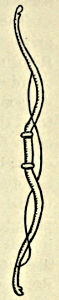 The Bow was a favourite weapon and of the usual Oriental pattern, being composed of horn, wood, and the large sinews of certain animals firmly glued together. It was carried partly unstrung over the shoulder when not in use; the total unstringing was not advisable because of the time occupied in getting it ready, most Asiatic bows bending backwards into an oval shape when unstrung, and requiring much physical exertion and time to replace the string. The quiver was also suspended in the same position, containing arrows of some length made of cane.
