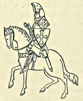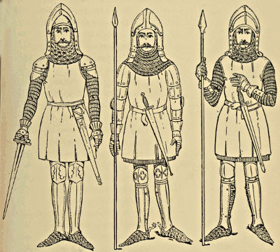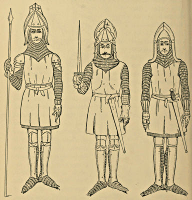It is curious to note how in the early part of the Middle Ages the same general outline of military equipment prevailed over the civilised portion of the continent of Europe, and this is exemplified in Fig. 441, taken from Add. MS. 11,695, a Spanish parchment of the eleventh century. If the warriors delineated in it are compared with those represented upon the Bayeux Tapestry, the only essential differences to be discovered are the excessive lengths of the hauberk and gambeson, and also the circular shield. The trilobed pommels of the swords and the cross guards of the lances suggest a Scandinavian origin, but the hauberk, nasal helmet, and leg defences are almost exact counterparts of the Norman equipment. Again, in Fig. 442, which represents a continental warrior of the year 1100, the general appearance is similar to our own knights of the Chain Mail Period, if we except the peculiar helmet and the deep indentations in the skirt of the surcoat. The[Pg 352] coif-de-mailles, hauberk, chausses, shield, and sword are almost precisely the same. In the year 1330 the continental equipment was the same in its broad character as in England, which may be seen from Fig. 443, taken from Add. MS. 12,228 in the British Museum, where the only differences are the trefoil coudière and the laminated brassarts, which were not general in our country, although isolated instances occur of both. During the Camail and Jupon Period the plate armour was precisely similar all over the Continent, the only variations being in the shape of the jupon, which was sleeveless in England, but was often provided with baggy sleeves ornamented with rows of buttons in other countries, chiefly Spain and Italy, while tight sleeves were worn in Germany. The frequent intercourse between the Continent and ourselves in the fifteenth and sixteenth centuries led to the free introduction of foreign supplies, and English armour lost what little insular character it formerly possessed.