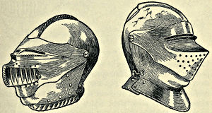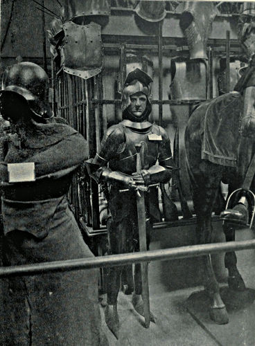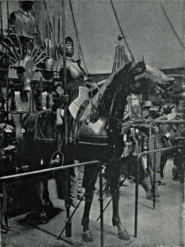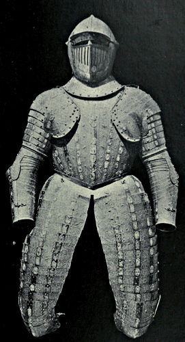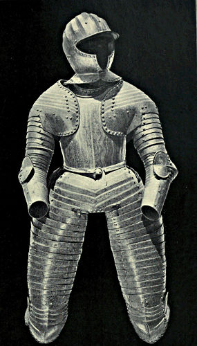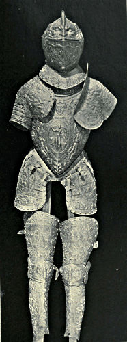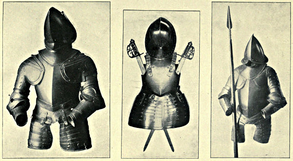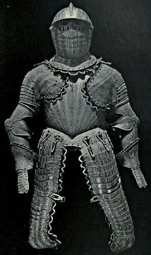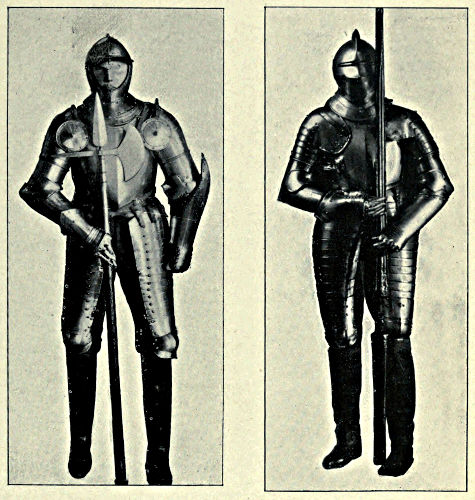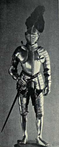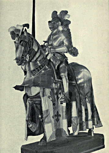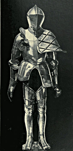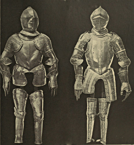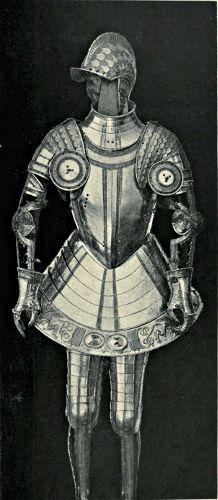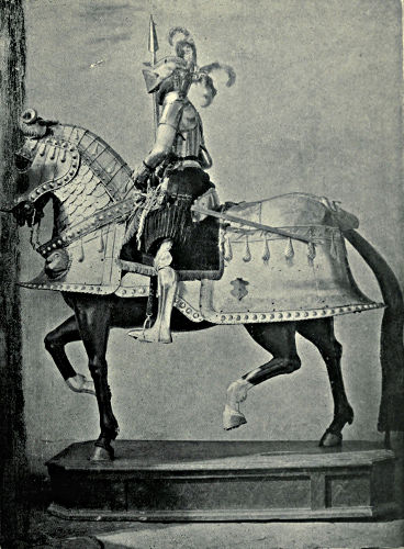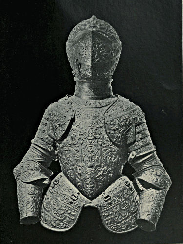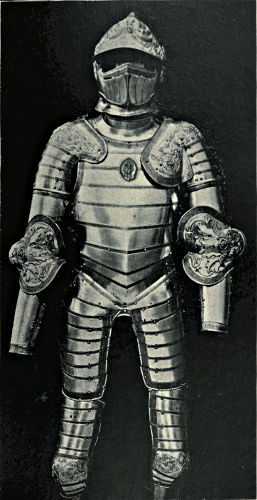 It may come somewhat in the nature of a shock to the self-complacency of the average Englishman to learn that in the great stores of armour in the public and private collections of Great Britain and Ireland only an infinitesimal portion is of English origin, and also that England was never celebrated in any age for the output of reliable suits. The excellent quality of English steel is, at the present time, accepted throughout the world, while the care and finish bestowed upon articles fabricated from it is proverbial, and in marked contrast to that of many other nations. This fact is so well known that the average inhabitant of our isles unconsciously places armour in the same category, and believes as a matter of course that it was pre-eminent in the Middle Ages. But the superiority of British iron is a matter of the last two or three centuries, and only sprang into existence when armour was becoming obsolete, whereas upon the Continent the manufacture in some places dates back almost to remote antiquity. This is especially the case with regard to Germany, whence has emanated the great majority of the armour seen in our museums. If we take the Wallace Collection, for instance, we find that sixteen cap-à-pie suits are contained in it, of which thirteen are German, two Italian, and one English. Of this number the eight ear[Pg 350]liest, dating from 1460 to 1560, are of German manufacture. Of the three three-quarter suits dating from 1520 to 1540 the whole are German, while of the nine half-suits only one is Italian, the remainder coming from Germany. A similar comparison taken in other museums would probably give a like result. If, however, a collection has no suits of armour previous to the year 1605, a probability exists that English armour might occupy the second if not the first place, inasmuch as the half and three-quarter suits in use during the Civil Wars were largely made in England. It must not be supposed, however, that the English armourers of the Middle Ages were incapable of manufacturing defensive or offensive equipments, for it is almost certain that the greater part used from the time of the War of the Barons to the Wars of the Roses was fabricated at home, always excepting that worn by royalty and the most prominent nobles. English armour was, however, heavy and cumbrous, the inferior quality of the metal necessitating great thickness in order to secure efficiency; consequently those who could afford it procured the foreign article, where the superior temper gave a minimum of weight with the same or even better protection. It may be compared to the modern Harveyised steel plate for battleships, of six or eight inches in thickness, which affords greater security than the eighteen inches of iron formerly in use. A large amount of foreign armour has found its way into our country owing to the law of tournaments, whereby the equipment of the vanquished became the lawful spoil of the victor; while the prolonged wars waged upon the Continent by English armies—invariably with some degree of success—must have furnished both the[Pg 351] knight and the common soldier with means of defence superior to that of home manufacture.
