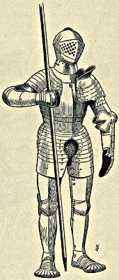 During the Splinted and Camail Periods the men-at-arms invariably dismounted and fought upon foot, and in order to adapt the lance to these altered conditions it was cut down to about five feet in length. Later in the Camail Period a small circular plate was fixed upon the lance to protect the hand, and this subsequently developed into the vamplate of varied form and dimensions. At this time also the shaft of the lance became much enlarged for tilting purposes, and was made hollow, with longitudinal grooves upon the exterior; in this form it splintered in the encounter; when the tilting had for its object the unhorsing of combatants the lance was made stronger and heavier. During the reign of Elizabeth the lance ceased to hold the important position it had hitherto maintained among weapons, and became obsolete, but in later times it has been revived for the use of cavalry.