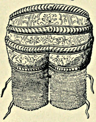 The Tunic.—This appears to have been of thick quilted linen or of leather, as sometimes long hair is shown upon it. It reached to the knees and had half-sleeves: at times a pectoral is shown of large proportions. Another, and much more military style, consisted of rope fastened side by side, and so bound round the body that it had the appearance of a tight-fitting cuirass. This would be much more efficacious against the sword and the arrow than the tunic. It generally terminated at the waist. In the earlier sculptures there are no indications of the metal cuirass or of greaves, but the latter subsequently came into vogue; they were of metal and reached to the knees.