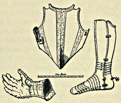 Plate XXI.*, p. 236, is a suit of Milanese make, early seventeenth century, intended for war purposes, and absolutely devoid of ornamentation. An example of Flemish armour of 1624 is represented in Plate XXIII.*[Pg 358], p. 268; it was sent by the Infanta Isabel Clara Eugenia to Philip IV. The ugliness of the breastplate and the huge rivet-heads upon the pauldrons are strongly suggestive of the “boiler plate” armour prevailing in England at the same period. Plate XXXV.* is a suit presented by the Cardinal Infante Ferdinand to Philip IV., and exhibits the lames of plate inserted in the gousset of the coudière, similar to the Henry VIII. foot armour in the Tower. It is of Milanese make, and decorated with vertical bands of medallions, &c.
