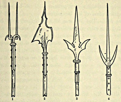 The Fork.—The military fork undoubtedly owed its conception to the agricultural implement, and in its earlier forms was of equally simple construction. The two prongs were eventually made of unequal length, and examples are to be found having three prongs, all unequal. As usual with shaft weapons, hooks were added with which a horseman might be dismounted from his charger, and barbs were occasionally added to give effect to side blows. During the fourteenth century it was much used; it appeared as early as the eleventh century, and was not entirely discarded until the end of the seventeenth. Plate XXVII. from the Edinburgh Collection is a scaling-fork with a particularly long shaft, the very prominent hooks being designed to drag defenders off the battlements.