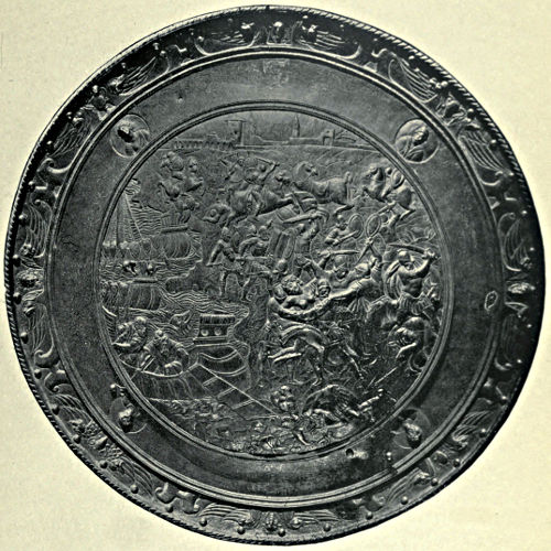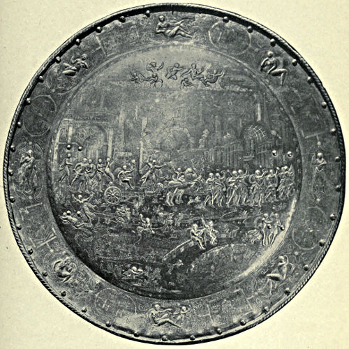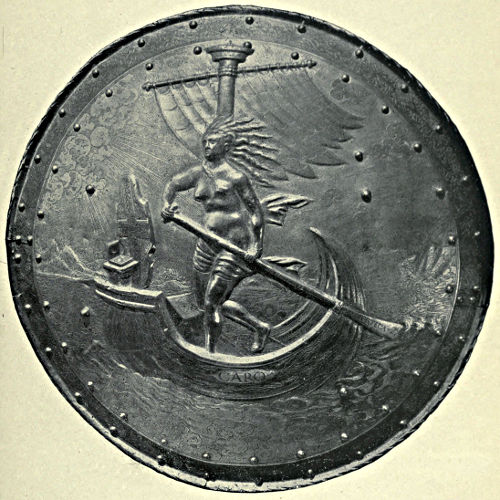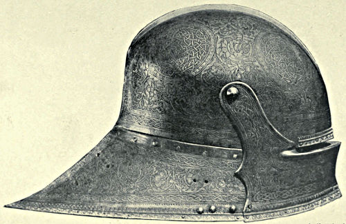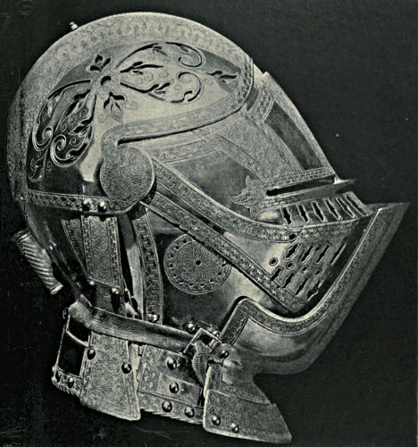 During the fourteenth century the Italian armourers had been making steady progress towards fame, and in no city more so than Milan, where, towards the end of the century, armourers came to the front whose names are famous. A Milanese salade, c. 1480, is represented in Plate VII.*, p. 60, and was produced by one of the Negroli family, who made their home in the city. The salade is cast in one piece, except the visor, and the ornamentation is a pleasing combination of the Italian and Oriental styles. The delicacy, vigour, and force of its execution may readily be perceived upon inspection of the illustration. Another example of the work of the Negrolis is given in Plate X.*, p. 80, which represents a three-quarter suit made for Charles V. The Milanese were among the first to feel and acknowledge the influence of the Renaissance in their work, and the decorations upon the pauldrons, coudières, &c., of this suit exemplifies it.
