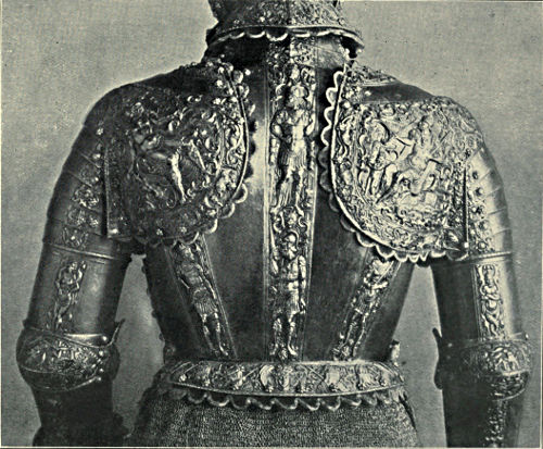 The year 1554, which saw the production of some of the above suits, probably witnessed the delivery of another to King Sebastian of Portugal, which is preserved in the Royal Armoury at Madrid, and is perhaps the most magnificent in the whole collection. The details of the backplate, pauldrons, and arm defences are shown in Plate XX.*,[Pg 357] p. 232. It is the work of Anton Pfeffenhauser of Augsburg, and undoubtedly his masterpiece; as an example of repoussé work it places him upon an equality with the best German masters of his time. “Mythological figures are embossed upon the bands traversing the backplate; designs symbolical of Power, Victory, Peace, and Navigation are represented on the pauldrons, back and front, while the coudières display the four figures of the cardinal virtues.” It is essentially a pageant suit, as is also the one presented to Philip III., when prince, at the age of seven. It is a half-suit of Italian workmanship, formed in gilded iron and decorated with figures, masks, &c., all embossed and damascened (Plate XVIII.*, p. 196). Another, presented to the same monarch in his childhood, is represented in Plate XIX.*, p. 212, and is believed to be the work of Lucio Picinino of Milan. The decoration is less profuse but quite as beautiful as in the preceding example. A piece of Spanish armour made at Pamplona in Navarre in 1620 is shown in Plate XXII.*, p. 240. Mr. Calvert states: “It is of steel-plated iron and of extraordinary thickness.… A curious feature is the seven indentations made by the bullets of an arquebus, and each set with silver pearls. These marks do not say much for the quality of the metal, which is 10 millimetres thick. The backplate, which is only 3 millimetres thick, has been perforated by a bullet. The arms are defended by espaliers reaching to the elbow, where they meet the cuffs of the gauntlets.”