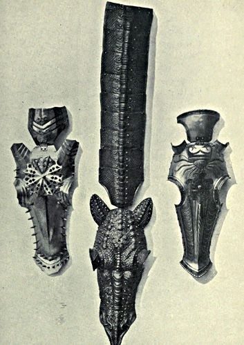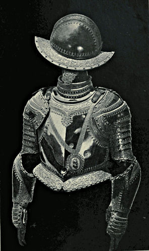 A second example of armour of Spanish make is given in Plate XXXVI.*; it was fabricated at Pamplona for the Duke of Savoy in 1620, and is decidedly an improvement upon the suit shown in Plate XIX.*, p. 212, which came from the same locality. It is worthy of remark that Spain, with all its vast resources of the finest iron ores in the world, did not become a centre for arms and armour. She was undoubtedly able to supply her own requirements, and in the wars against the Moors these were of no mean order, but no distinct Spanish “School” was evolved similar to the German or Italian. The excellent quality of her swords attained world-wide reputation, and the blades of Toledo, Bilbao, and Seville are justly famous. No town in France achieved special success in armour or arms, although many were active in the production. Burgundy was chiefly noted for its eccentricities, the breastplate illustrated in Fig. 445 furnishing an example, though many inventions, such as the burgonet, emanated from that warlike district, whi[Pg 359]le its hand-gun men of the fifteenth century were the best in the world. Holland and Belgium have always enjoyed a reputation for arms, and Netherlandish weapons and defences were in great demand. The overwhelming superiority of Italian products must not be ascribed solely to one town, Milan, for many others were famous, such as Pisa, Verona, Lucca, Mantua, and Brescia, while Florence became a serious rival to Milan in the latter part of the sixteenth century. In Germany, Augsburg and Nuremberg probably were the most renowned for armour, but Cologne bore pre-eminence for weapons.