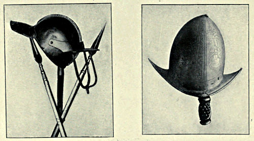 The Pikeman of the time of James I. was accoutred in a morion-shaped helmet with a comb of moderate size and a flat brim, not curved, but pointed back and front. It was provided with a holder at the back, in which four or five large feathers were inserted. A back- and breast-plate reached to the waist, to which were affixed two broad tassets meeting in front of six plates each (Plate XXIV.), which spread over the well-padded breeches, reaching to the knee and covering the front part of the limbs only. No[Pg 317] gorget or defences for the arms are shown. His arms are a pike and a sword. Grose in his “Military Antiquities” illustrates thirty-two different positions in the exercise of the pike. The pikeman of the Cromwellian period had a similar accoutrement, but his morion may better be termed an iron hat, inasmuch as the crown is low with a small comb, the brim wide and drooping and coming well over the eyes and the back of the neck, and it is without plumes (Fig. 427). Two cheek-guards are added. A back- and breast-plate with pendent tassets consisting of many plates formed with a leather coat and the helmet the sole protection. In Charles I.’s reign a rondache was served out to pikemen, but after a few years was discarded.