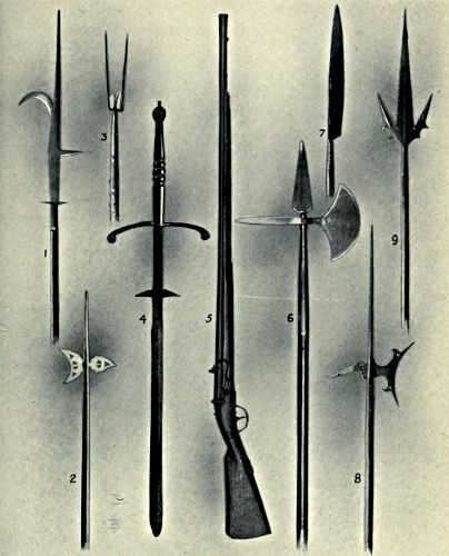 The Voulge.—This weapon may be regarded as a cousin to the guisarme, from which at times it differed but little. In its simplest form it consists of a broad blade fixed at the side of a shaft, and attached to it by two or more rings which spring from the back of the blade. The latter is invariably carried up to a sharp point over the axis of the shaft, and some examples show a spike upon the side opposite to the blade. The voulge is a Swiss weapon, and was in use by that nation at a very early period; it did not become popular among the Continental nations, although the French seem to have used it in the fifteenth century, when the arbalestiers were armed with it.