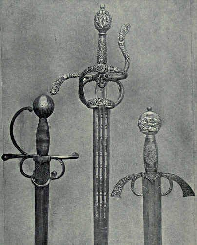 In the Transition and Maximilian Periods the sword underwent many changes, chiefly in the hilt, which presented a bewildering variety of additional pieces, all intended for the protection of the hand and the entanglement or breaking of the sword-blade of the opponent. Four examples are given here from the Royal Armoury at Madrid which exhibit these extra guards (Plates XXVIII.* and XXIX.*). The old cross-piece did not die out, but became bent in another form as a capital S; rings appeared on either side of the cross-piece and at right angles to it; back-guards were introduced, and also the basket-hilt. The quillons, by being curved as indicated above, developed the knuckle-guard on one side of the grip which eventually reached the pommel, while the other,[Pg 336] circling towards the blade, developed counter-guards for protecting the back of the hand. Thus the rapier-guard was developed, the varieties and modifications of which are almost numberless. The Wallace Collection contains a matchless array of these beautiful weapons, the earliest dating from 1540: some of these have lavish ornamentation bestowed upon them. Broadly speaking, cup-hilts were a common form where long, straight, or curved quillons were used in conjunction with a cup-shaped finger-guard at the base of the blade, which was as a rule highly decorated. The swept hilt had a broad back-guard which narrowed towards the pommel, together with curved quillons. Upon many swords of the sixteenth century and later curved guards may be seen extending round the ricasso; this is the pas d’ane, while rings may also be observed for passing the thumb through. The rapier blade was long, thin, and tapering; it was essentially a thrusting sword, but not exclusively so. These weapons were for parade and the duel, a two-edged rapier of special design being used in war. During the eighteenth century the general tendency of the hilt was to become less complicated and to develop the simple basket form.