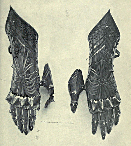 It may be stated as a general fact that no authentic suits anterior to the year 1400 are in existence, although many separate pieces are preserved which were made before that year, chiefly helmets, mail, gauntlets, and a few pieces of plate. The same may be said of the armour prevailing[Pg 353] from 1400 to 1440, though larger and more numerous portions of it exist, but of the Gothic armour which came into being after that date a number of complete suits are extant. Germany was almost the sole maker of this description of defence, and not only are the majority of suits of this period of German make, but Germany itself has for long been the happy hunting-ground of collectors, and was at one time deemed almost inexhaustible. There are many German armourers whose names have been handed down upon the roll of fame, but the most honoured bore the name of Colman. This family had settled in Augsburg in the latter part of the fourteenth century, and gradually established a reputation; the most famous and best known being Lorenz Colman, who began work in 1467. He was patronised by Maximilian, King of the Romans, a few years later, and appointed Court Armourer in 1490. In conjunction with the emperor there can be no doubt that the Maximilian style was evolved in the first decade of the sixteenth century. Lorenz died in 1516, and an example of his workmanship dating from 1515 may be seen in a cap-à-pie suit in the Wallace Collection. His successor, Koloman Colman, surnamed Helmschmied, produced many wonderful examples of skilled workmanship, such as are exemplified in his suits constructed for the Emperor Charles V. (Plate XXXIII.*), and preserved in the Royal Armoury at Madrid.[2] In Plate XXX.*, the large tilting-piece, comprising grande[Pg 354] garde, volante piece, and pauldron in one defence, is remarkable, while the pair of gauntlets belonging to the same monarch and illustrated in Plate XXXII.*, are admittedly the most superb examples in existence. The magnificent flutes, together with the delicate enrichments of the gadlings, have probably never been equalled. The style of ornamentation agrees exactly with that of Colman Helmschmied.