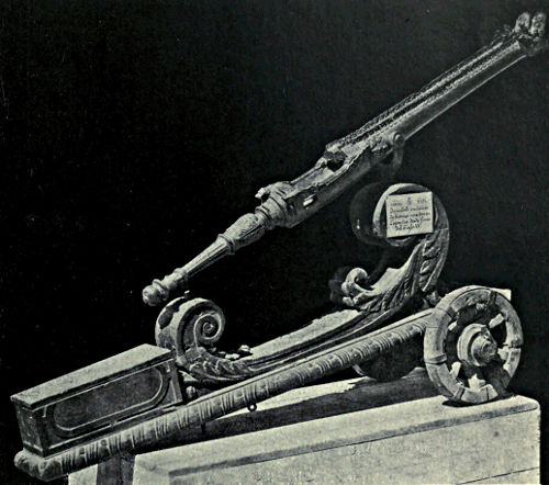 Various machines were invented during the Middle Ages, in which the principle of propulsion was the steel bow mounted upon a frame partaking of the nature of the arbalest. These bows were at times of considerable size, and threw javelins, spears, and weapons of a similar nature. Being mounted upon wheels, they served all the purposes fulfilled by modern field artillery. In the same category may be mentioned one which threw one or two stones[Pg 348] at a single discharge: it consisted of a vertical spring of steel which was pulled backwards by ropes and pulleys, and upon being released threw one missile from a sling attached to its extremity and another from a cup fixed to the steel.