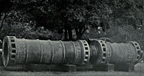 Cannon have been made of various materials apart from iron and bronze, such as wood, paper, and rope, the outside covering being of leather. All the early guns used in England were obtained from abroad; the first foundry in England was that of Hugget of Uckfield, Sussex, in 1521, who cast cannon in brass and iron, using the Sussex iron smelted with charcoal. There are some pieces of ordnance preserved in the Rotunda at Woolwich which are of this age, and may possibly have come from the Sussex foundry. Examples of early cannon are rare in England, but on the Continent many may be found, especially in Belgium. The Rotunda and the Tower of London probably contain the finest specimens in the British Isles. In the Royal Arsenal at Madrid is pr[Pg 365]eserved a small piece of ordnance dating from late fifteenth century. It is double-barrelled and breech-loading, and exhibits a wealth of ornamentation upon almost every part (Plate XXXVII.*). A breech-loading peterara of forged iron of the time of Edward IV. is in the Rotunda, and is illustrated in Plate XXXIX. It is made of longitudinal bars of iron hooped together with iron rings; the powder-chamber with its lifting handle is seen in position, and a simple locking arrangement prevented its blowing out upon the discharge. Trunnions are affixed to the piece, and the metal by which it was attached to the long-decayed wooden gun-carriage is still preserved. The length of the gun is 3 feet and the calibre 2½ inches, while the name implies that the shot was of stone. This very rare piece of ordnance is in excellent condition.
