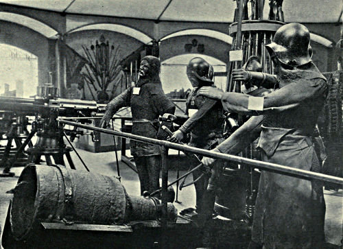 The invention of gunpowder and its use in propelling missiles from tubes was the signal for the abolition of armour, as we have indicated, though the struggle for supremacy between the two lasted for considerably more than a century. The Eastern nations are generally credited with the discovery of the properties of a mixture of saltpetre, carbon, and sulphur so far as their use in fireworks is concerned, but it was undoubtedly to the Western nations that the knowledge and application of the propelling nature of the mixture were due. The first authentic account of its use for military purposes must be ascribed to the seventh century, when, under the name of Greek fire, it was used at the defence of Constantinople by the Byzantine emperors against the invading Saracens. The true Greek fire, however, is supposed to have contained more ingredients than the three which constitute gunpowder proper, viz. resin and naphtha, the latter being in excess, and this mixture appears to have been so inflammable and so difficult to extinguish that the terror excited by its use was out of all proportion to the destruction that it wrought. It was propelled from balistæ, projected from tubes, and carried by means of arrows which bore tow steeped in the composition, while its use in a besieged town to pour down upon assailants was probably the most efficacious. Its composition was for [Pg 361]a long time kept secret, but the knowledge gradually spread, and during the later mediæval period its use was not unknown in England (Fig. 337). Gunpowder proper was used for the first time in the Spanish wars with the Moors in the twelfth century by both combatants; and the secret of its composition was discovered by Roger Bacon in the thirteenth century, probably from the translation of manuscripts. Schwartz, a German Frank, perfected it about a century later, and its first use in England occurred in the wars against the Scots by Edward III. in 1327, when the cannon were denominated “crakeys,” a diminutive from “crake,” the first name of the composition, which may be a corruption of “grec.” At the siege of Cambrai in 1339 cannon were in use, and they are specifically mentioned by Froissart. After that time their use became general, and in 1346 many were in operation at the battle of Creçy, the gunpowder being imported from abroad until the reign of Elizabeth, when English powder-mills were established in the country. The word artillery had been in use to denote projectile-throwing weapons anterior to the use of gunpowder, and became eventually the term by which the larger kind of firearms was designated. The construction of the first cannon was, as might be inferred, of the rudest possible description. Pieces or bars of iron were arranged longitudinally so as to form a rough tube, around which iron hoops were placed to hold them together. The powder and ball were in a separate case, open at one end to allow of the exit of the ball; this case was inserted in one end of the tube and secured by a stirrup arrangement pivoting upon two projections on either side of the tube, which fell over the open end and prevented the case from bei[Pg 362]ng blown out when the discharge occurred. The powder was fired by the insertion of a red-hot wire. The cannon was fixed down to a piece of timber which rested upon a similar piece: at the breech end of the cannon the two planks were hinged together, and by the insertion of wedges in the front between the timbers the piece could be elevated. Other contrivances almost as crude as that described were introduced in order to overcome the difficulties of taking aim. The projectiles were at first made of stone, and subsequently of lead or iron, or stone coated with lead. It must not be supposed that the introduction of such weapons created the profound consternation which a few contemporary writers have led us to suppose; the general impression produced was, in fact, one of contemptuous indifference, and it was only after many improvements had been effected that cannon began to be taken seriously. The earliest were only used in sieges, as the transport of such cumbrous pieces was nearly an impossibility, and when they were subsequently adopted for use in the field it was but seldom they were used after the first discharge. During the fifteenth century fresh developments took place; trunnions were invented, whereby the recoil was transferred directly to the carriage; the weapon was cast in one piece which tapered towards the muzzle, and many improvements in loading and discharging were made. Bombards were introduced, being short pieces with a large bore which were fired at a considerable elevation and discharged balls of stone to a small distance; they were the prototypes of our modern mortars and howitzers. One of the earliest examples of mediæval ordnance preserved in this country may be seen at the Rotunda, Woolwich (Plate XL., p. 366). It is known as[Pg 363] the Creçy Bombard, and may possibly date back to the time of Edward III. It is said to have been found in the moat of Bodiham Castle, Sussex, and is known to have been in Battle Abbey for many years. Its interior is of cast iron, one of the earliest known specimens of the metal in that form, and iron hoops have been shrunk upon this inner core. The chamber in the smaller portion of the breech will hold about three or four pounds of powder; the stone shot discharged weighed about a hundred and sixty pounds and was fifteen inches in diameter. The carriage is modern. The cannonier wears a capacious salade and is defended by a hauberk of mail and a thick leather apron; he is discharging the bombard with a hot iron and protects his face with his hand from the inferior powder blown off the touch-hole by the explosion.