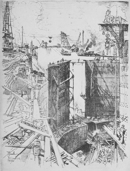 I did not bother myself about these things, nor about lengths and breadths and heights and depths. I went to see and draw the Canal, and during all the time I was there I was afforded every facility for seeing the construction of the Panama Canal, and from my point of view it is the most wonderful thing in the world; and I have tried to express this in my drawings at the moment before it was opened, for when it is opened, and the water turned in, half the amazing masses of masonry will be beneath the waters on one side and filled in with earth on the other, and the picturesqueness will have vanished. The Culebra Cut will be finer, and from great steamers passing through the gorge, worth going 15,000 miles, as I have done, to see. But I saw it at the right time, and have tried to show what I saw. And it is American—the work of my countrymen.