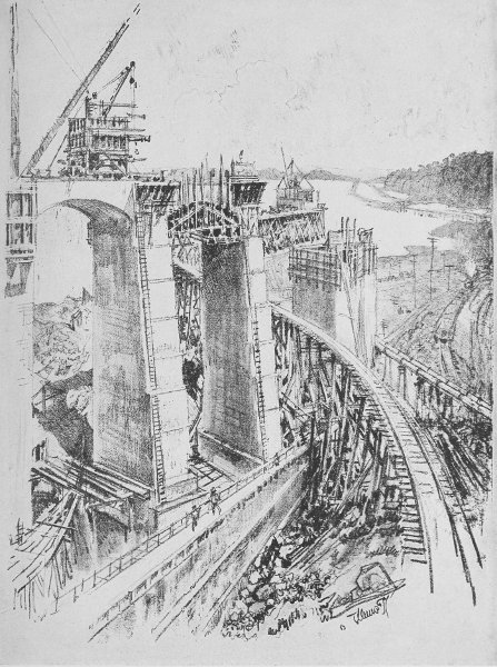 THESE huge arches, only made as arches to save concrete and to break the waves of the lake, are mightier than any Roman aqueduct, and more pictorial, yet soon they will be hidden almost to the top by the waters of the lake. Electric locomotives will run out to the farthest point, and from it, tow the ships into the lock. Beyond is Gatun Lake, and to the right the lines of the French Canal and Chagres River stretch to the horizon. Even while I was on the Isthmus the river and canal disappeared forever before the waters of the rapidly rising flood. All evidence of the French work beyond Gatun has vanished under water. I did not draw the Dam or the Spillway simply because I could not find a subject to draw, or could not draw it.