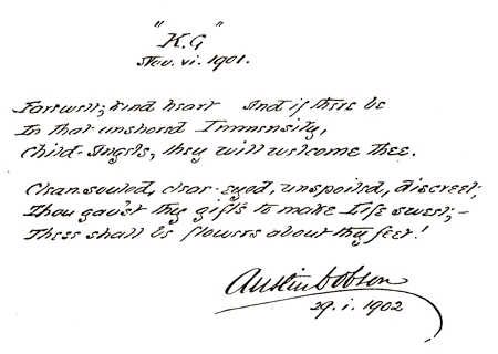 [77] Published by Mr. Austin Dobson in his delightful article on Kate Greenaway in the Art Journal, and written by him, on the 29th January 1902, in the Album of Mr. Ernest G. Brown, and here printed by consent of both gentlemen.
