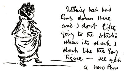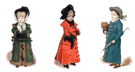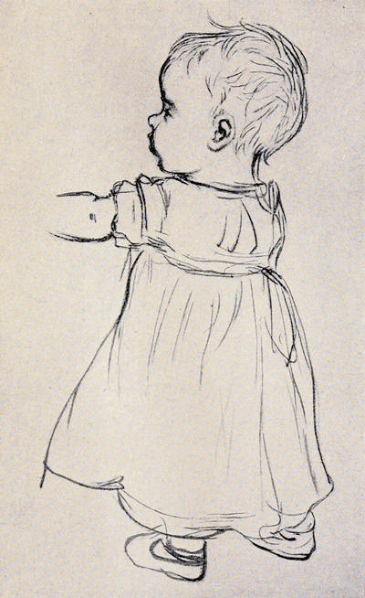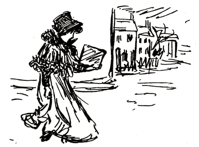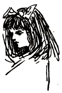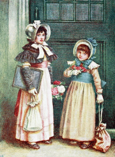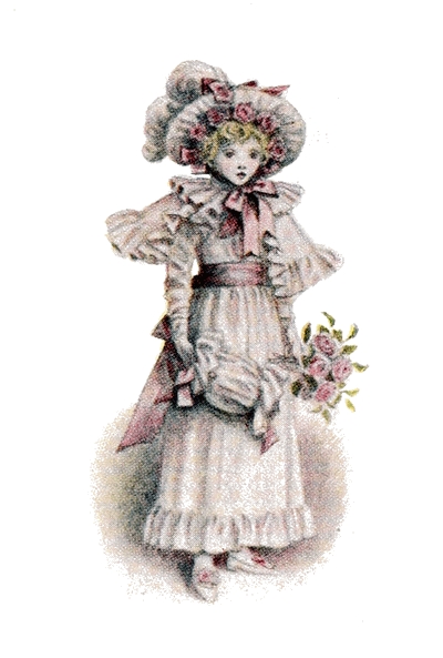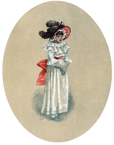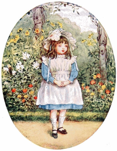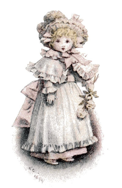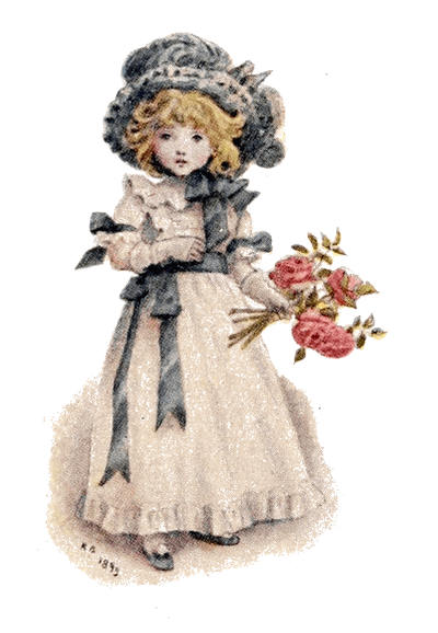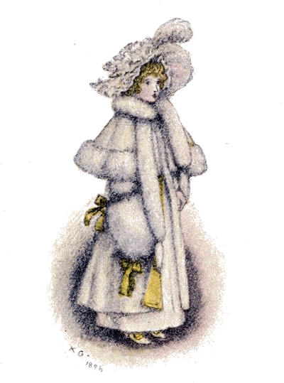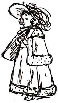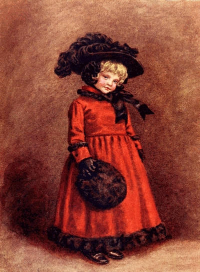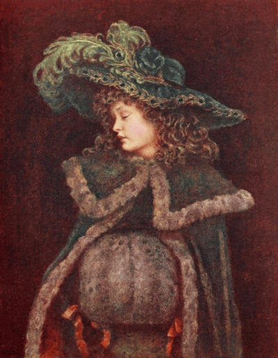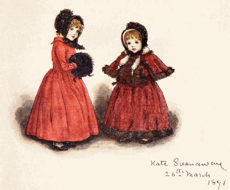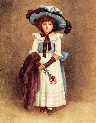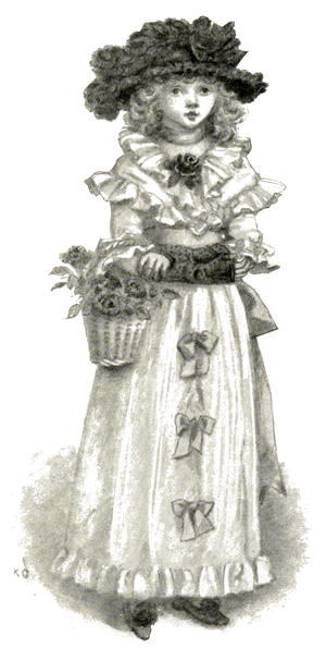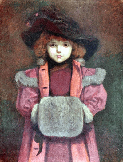 [72] The net profit to Miss Greenaway was £645. The most important pictures sold were ‘Little Girl with Tea Rose’ (35 guineas), ‘Going to School’ (35 guineas), ‘Betty’ (35 guineas),’Girl in Pink and Black—Grey Muff’ (60 guineas), ‘Little Girl in Scarlet Coat and Tippet’ (35 guineas), ‘A Girl in Hat and Feathers’ (45 guineas), ‘Thoughts of the Sea’ (35 guineas), ‘Two Girls in a Garden’ (35 guineas), ‘Lilies’ (35 guineas), and ‘Baby Boy in Blue Coat and Tippet’ (35 guineas).