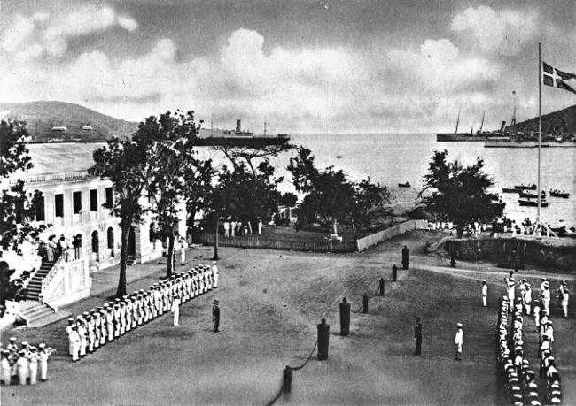 A price was finally agreed upon, and the transfer of the islands took place March 31, 1917. The ceremony was most impressive, though Governor Oliver, appointed by President Wilson, could not arrive in time to take part in it. Commander Pollock, of the gunboat Hancock, was at Santo Domingo and was ordered to proceed at once to St. Thomas and take possession in the name of the United States. He arrived on the day of the ceremony, and was met by the Danish governor, Danish officials, and officers and marines of the Danish gunboat Valkyrie. In the presence of a large assemblage the Danish flag came down after nearly two and a half centuries of rule, and the Stars and Stripes was raised over the former Danish Government buildings, over forts, and on various private flagstaffs. Many of the Danes were in tears. A number of them had been born on the islands and knew no other home. To them it was a sad event, but practically all realized that the transfer was best for the people generally and for the future of the islands.