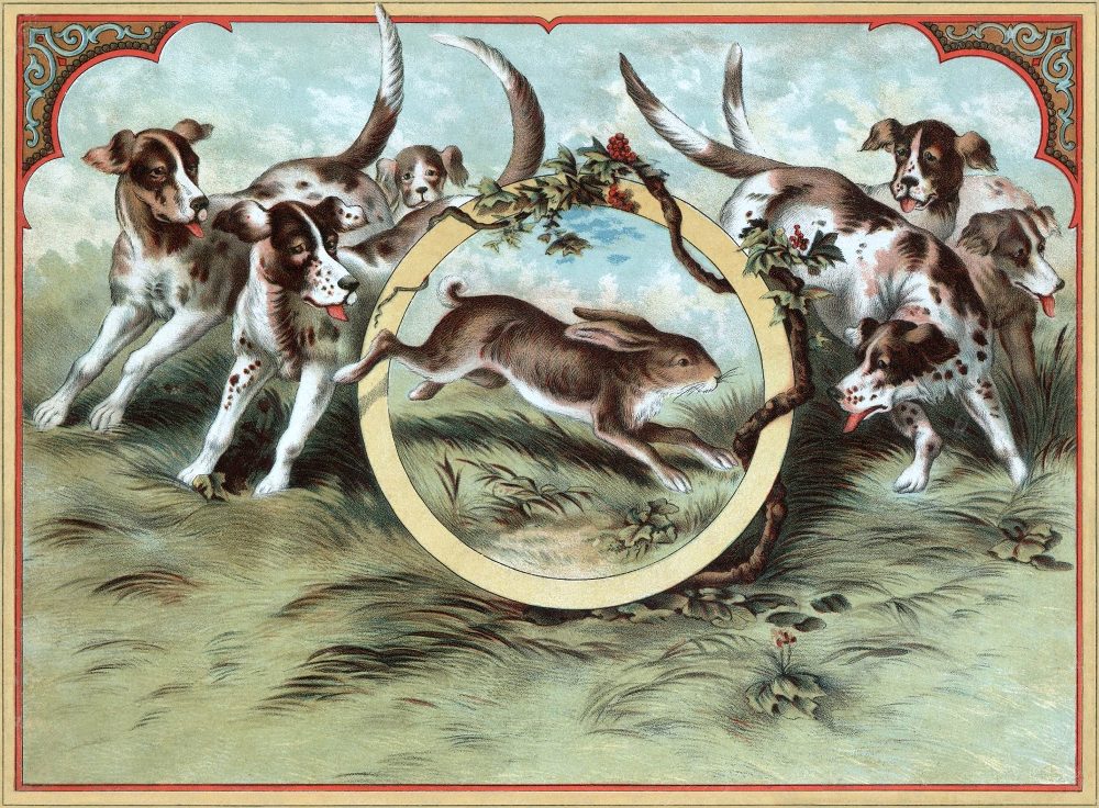 VIII. Mad the races, Jolly the Hare, Little did he Reck or care. |