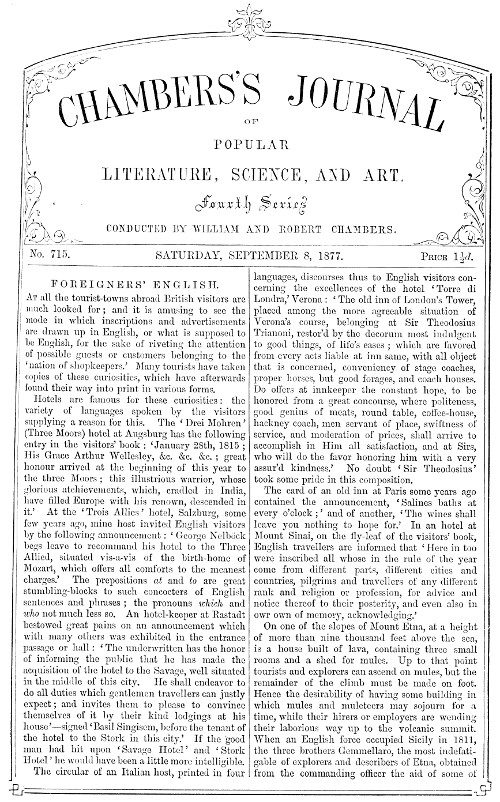 At all the tourist-towns abroad British visitors are much looked for; and it is amusing to see the mode in which inscriptions and advertisements are drawn up in English, or what is supposed to be English, for the sake of riveting the attention of possible guests or customers belonging to the 'nation of shopkeepers.' Many tourists have taken copies of these curiosities, which have afterwards found their way into print in various forms.