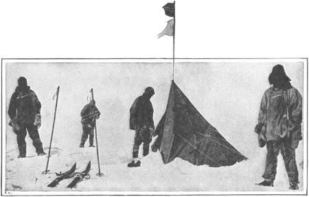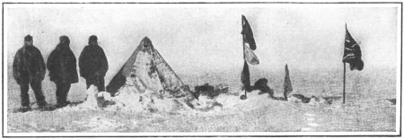 With four companions, Captain Scott on the final dash for the Pole left his main party in camp at Cape Evans, the base of operations on McMurdo Sound. On January 17, 1912, the South Pole was reached at last; but they found to their great amazement that they had been preceded by over a month by Amundsen and his party, who attained the Pole on December 14, 1911. The calculations of the two expeditions located the Pole on nearly the same spot.