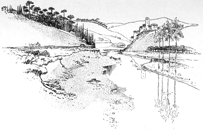 Our way was through the beautiful Val di Chiana, no longer pestilential and full of stenches as in Dante's day, but fresh and fair, and in places sweet with clematis. There were no fences or hedges, and it stretched from mountains to mountains, one wide lovely park. About half-way to Castiglione we came to the boundary line between Tuscany and Umbria,—a canal with tall poplars on its banks, throwing long reflections into the water below, where a boat lay by the reeds. We stopped there some little time. Sandrino was polite, but I could see he did not approve. What would the Speedvell Cloob have thought? Farther on, when we waited again near a low farm-house under the oaks, he wheeled quickly on. But presently he came back. "Oh," he said, "I thought you must have had an accident!"