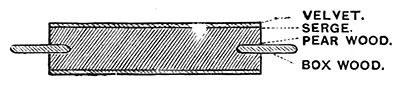 The Leather Roller consists of a wooden cylinder or stock of about 21 to 42 cm. in length and34 9 to 11 cm. in diameter, with handles at either end, usually turned in one piece with the cylinder. Boxwood handles are sometimes let into the ends of the cylinder, but although smoother to work, they not infrequently work loose. In using these rollers the handles do not come in direct contact with the hands, but are covered with a protection of stout leather, which not only protects the printer’s hands from heating, but enables him by a heavier or lighter grip of the handles to apply a heavier or lighter pressure of the roller—a point of great value in inking the plate.