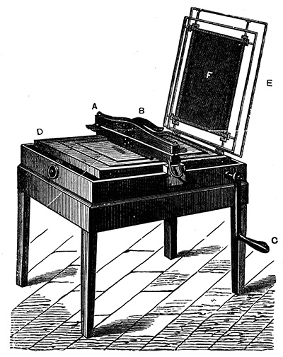 Woodburytype.—If an especially thick film of gelatine, containing a small proportion of pigment, be sensitised, exposed under a negative, and subjected to prolonged soaking in warm water, a picture exhibiting considerable relief will be obtained, which, after drying, may, by pressing into lead or treated by the galvanoplastic method, yield a matrix from which casts may be produced in a coloured gelatine solution, or ink, which is poured into the mould; on this is placed a waterproof paper; the press, which is21 of special construction, is closed, and the ink allowed to set; the paper is then removed, bearing upon its surface the printed Woodburytype, which is hardened by alum, and then scarcely distinguishable from a silver print.