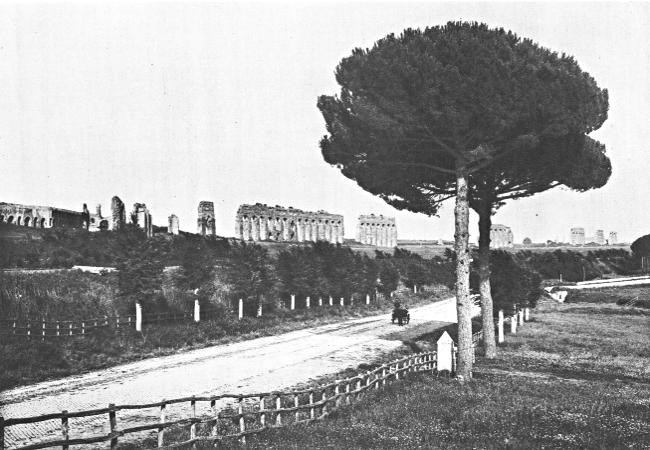 The most impressive features of the Campagna as we view it from the car window or in a stroll along either the old Appian Way or the modern Appian Way, are the ruins of aqueducts. The one here illustrated is the Claudia, named after Emperor Claudius, who completed it. Its sources were more than forty miles distant; while crossing the Campagna the water flowed in a channel supported by a series of gigantic arches. It provided Rome not only with her best water, but her most abundant supply, amounting to more than 400,000 cubic meters daily. All the aqueducts together poured into the city each day more fresh water than the Tiber now empties into the sea.