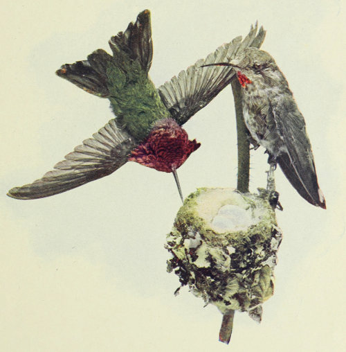 The high degree of intelligence possessed by the hummingbirds is shown in the construction of their nests. Some of the species make the nests “of such form or material as will serve to imitate natural excrescences of a branch, such as a knot or a pine cone.” Other species make a hammock-like nest that they suspend from cliffs by attaching spiders’ webs. Mr. Thomas M. Brewer writes: “Indeed, it is probable that there is no other family whose architectural achievements are more varied than those of the hummingbirds. These variations include not only the material of which the nests are made and the positions in which they are placed; but also the general style of their construction, exhibiting constant differences, in the several species, in the ingenuity and beauty displayed in each design.” Even individual species will change the usual plan of their nests in order to adapt them to the requirements of their environment. In favorable localities a new nest will be built each season on top of the old one of the year before. “The hermit hummingbirds fasten their elongated nests to one side of the extremity of long-pointed leaves for protection, it is supposed, against monkeys and other predaceous animals.”