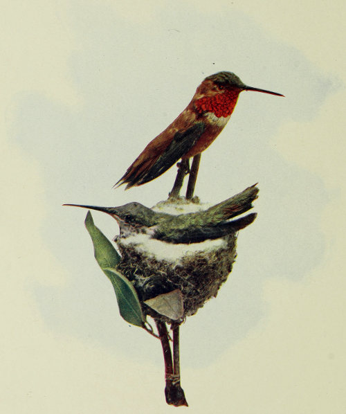 The Rufous Hummer is one of the earliest of the migratory birds to leave its winter home, and arrives within the borders of the United States early in March and is known to begin housekeeping as far North as the State of Oregon early in April. Altitude as well as climate seems to have much influence in the selection of a nesting sight. The altitude of the breeding range seems to lie between four and seven thousand feet above the sea level, and nests have been reported as high as ten thousand feet.