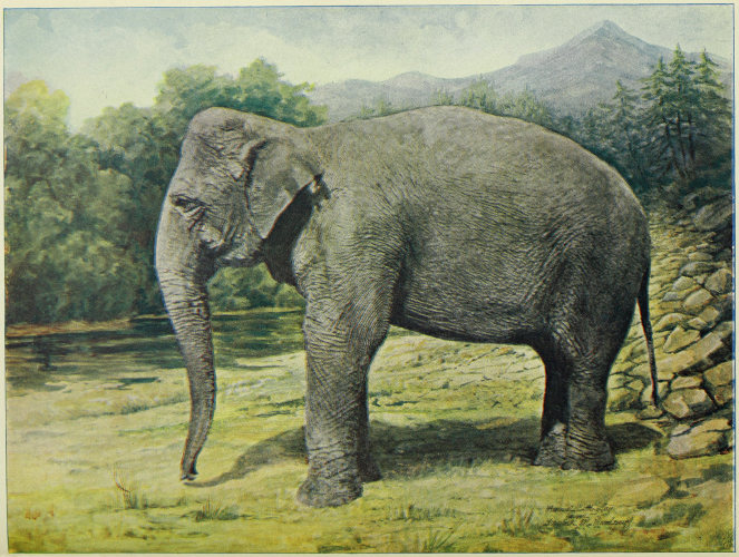 The Indian Elephant (Elephas indicus) inhabits the wooded parts of Southern Asia from the Himalayas to the Indian Ocean, and is found throughout Burmah, Siam and the Malay Peninsula. It differs from the African Elephant in having much smaller ears, a concave instead of convex forehead, smaller tusks, and in the possession of a finger on the end of the proboscis which, working against a tubercle on the lower part of the trunk, serves many of the purposes of the human hand.