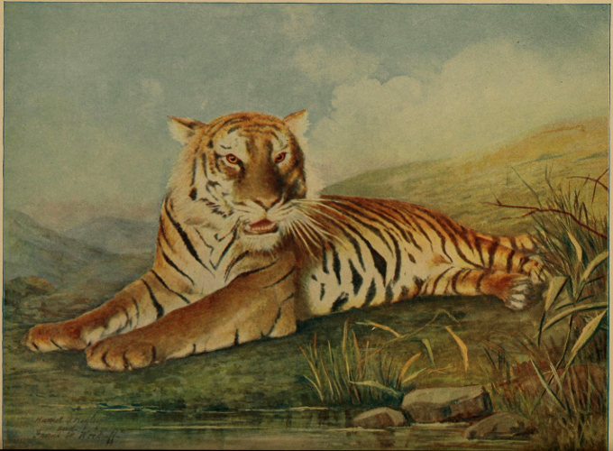 In color the Tiger matches the foliage of his native jungles. When lying in grass or even upon the ground the dark markings and rufous fawn colors of his body blend almost perfectly with his surroundings, and it has often happened 96 that his presence was only guessed by the thrashing of his nervous tail in the grass as he gathered for a leap. Grassy plains and swamps are his favorite abiding places, and he does not hesitate to swim from island to island in search of prey. Curiously, again, for a cat, the Tiger does not climb trees except when forced to do so by floods.