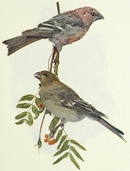 Speaking of the Pine Grosbeaks of Siberia Mr. Seebohm says, “Almost all the forest districts are hilly and in the north, as the trees become smaller, they are also more thinly scattered over the ground and the interminable extent of wood is broken by occasional flat, open spaces and open marshes which become gray with flowers as soon as the snow melts. The scenery is much more park-like than further south and these birds are much more plentiful and more easily seen. In the large pine forests they prefer the banks of the rivers or the outskirts of some open place and may often escape detection because of their habit of frequenting the tops of trees. Within the Arctic circle many of the trees are small and on the hilly ground they are scattered in small clumps. In places like these the Pine Grosbeaks may often be seen perched conspicuously on the top of a spruce fir, twenty or thirty feet from the ground but looking so much like the last spike of the tree as frequently to escape notice.”