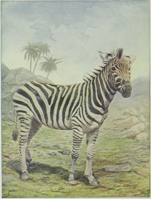 Of the three species, the mountain Zebra or true Zebra lives farthest south. It ranges over the mountainous country of Cape Colony. It is the smallest of the three varieties, and is distinguished from the others, not only by the peculiar markings, but by the large ears, short mane and scantily haired tail. It is the only variety where the transverse markings of the legs extend to the hoofs.