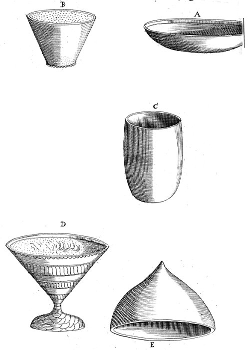 Cuscus, or Cusksoo, is the principal Dish among them, as the Olla is in Spain: This is made of Flower of Wheat, and when that is scarce, of Barley, Millet, Indian Corn, &c. They shake some Flower into an earthen Pan, made on Purpose, which is not glazed, sprinkling a little Water on the bottom of the Pan first, and then working it with both their open Hands flat, turning them backwards and forwards to grain it, 'till they make it much resembling Sago, which comes from the East-Indies. They stew their Flesh keeping their Pots close covered, which are made of Earth, put the Cusksoo into an earthen Cullender, which they call Caskass, B. vid. Fig. and this Cullender into the Mouth of the Pot, C. that so all the Steam which arises from the Meat may be imbibed by the Cusksoo, which causes it to swell, and make it fit to be eaten: When it is enough, for they love every thing tho[Pg 384]roughly done, they put this Cusksoo out into the Dish they serve it up in, which is somewhat like D. and the Cusksoo being heaped up, they make (as it were) a Bed or Place for the Meat to lie in, then they put good store of Spice, as Ginger, Pepper, Saffron, &c. This Dish is set upon a Mat on the Ground, and four Men may easily sit about it, tho' I have seen six and more at one Dish; they sit with their Buttocks upon the Calves of their Legs, with the bottom of their Feet on the Ground. If there are many to eat at this Meal, there are more Dishes. This Dish they have in use sometimes at Breakfast, as well as Dinner and Supper, but it is commonly used for the two last Meals. They cover it with a thing made on purpose, somewhat like E. and it will keep hot enough two Hours. At a stately Entertainment they will have a Sheep roasted whole, sometimes a half, or a quarter, on a wooden Spit, or the most convenient thing they can find. They do not continually keep turning it, as we do, but leisurely let one side be almost roasted before they turn the other. The Fire is commonly of Wood burnt to clear Coal, and made so, that the Heat ascends to the Meat. They baste it with Oil, and a little Water and Salt incorporated. They let it be thoroughly roasted; then they say, Bismiillah, In the Name of God, after they have washed their Right Hands, and pulling the Meat in pieces, they fall to eating. It is to be noted, that they never use but their Right Hand in eating, and one holds whilst the other pulls it asunder, distributing the pieces to the rest, as he pulls it[Pg 385] off. They seldom use a Knife, and a Fork is a strange thing among them. They are dextrous at this way of carving, and never flinch at the Heat or warmth, for that would look mean, and might occasion one more bold to take his Office upon him to perform. When they have done, they lick their Fingers, and as often as they have a hot Dish, they wash their Hands afresh. Then they have Alfdoush, or Virmizzelli, with some Meat on it, stew'd Meat, well spiced, with savoury Broth; which after they have eat the Meat, they dip their Bread in the Sauce, or Broth, and eat it. They are cleanly in their Cookery, and if a Hair be found it is a capital Crime, but a Fly not, because it has Wings, and may get in after it passes from the Cook's Charge or Management; to be well and strongly season'd is no great Fault; and if one should say it is too high of Pepper, they'll reply, it is better to be Ah than Faugh; alluding to the Differences between a strong, high, or hot, and savoury Taste, and an insipid, watry, or unpleasant. Cubbob is small pieces of Mutton, with the Caul of a Sheep wrapped on them. Some make good Cubbob of the Liver, Lights, and Heart. They Pepper and Salt them, and put Sweet Herbs and Saffron into them, and then roast them, and when they dish them up, squeeze an Orange or two on them. Thus they use commonly in their stew'd Meats, Lemon and Orange for Roast or Fish.