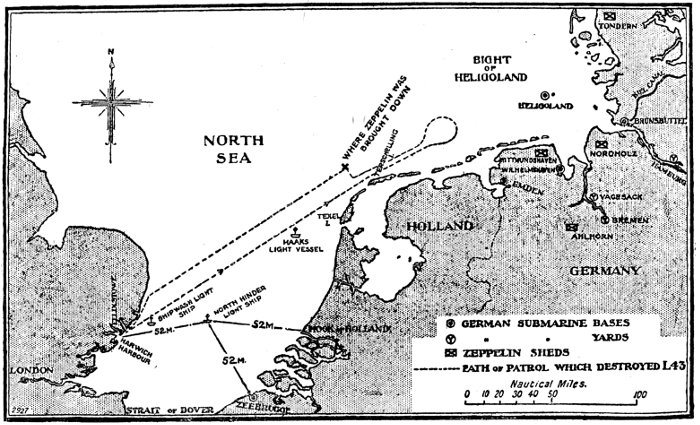 Harwich Harbour is a sheltered stretch of water on the East Coast made by the rivers Stour and Orwell emptying into the southern portion of the North Sea. It was the centre of intense anti-Hun activity. It was here that Rear-Admiral Tyrwhitt had his "hot-stuff" destroyer flotilla, that the hydrophone for detecting enemy submarines under the surface of the sea was evolved, that our own submarines which operated in the Bight of Heligoland had their base, and where the flying-boat station of Felixstowe was situated. And it was at Felixstowe that the service experimental flying-boats were designed and built, and a flying-boat squadron operated. During 1917 this squadron, which used an average of only eight boats a month, sighted forty-seven enemy submarines and bombed twenty-five, besides destroying enemy seaplanes and bringing down a Zeppelin in flames.