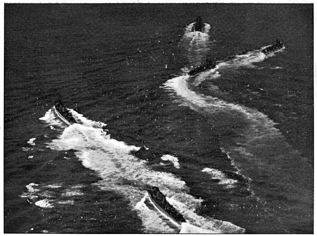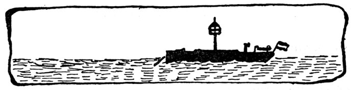 A submarine is a steel boat shaped something like a cigar. When on the surface it is driven by two petrol engines. Under the surface it is driven by two electric motors, the electricity being obtained from storage batteries. At the bow and stern are horizontal rudders known as hydroplanes. Under ordinary circumstances, when the submarine is about to dive, water is let into tanks until the boat is just floating on the surface with[Pg 6] only the conning-tower showing. The petrol engines are stopped and the electric motors are started. Then the hydroplanes are turned down and they force the submarine under the water. The submarine uses its power of travelling under the water to stalk its prey and to hide from its enemies.