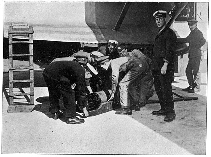 Crossing the quarter-deck and steering close to the bright and shining ship's bell, which I passed on my left, I found a path leading to the harbour. The left side of the path was the starting-point of an interminable row of huts for the men. Carrying on, after stumbling over a railway siding, and passing between two of the huge seaplane sheds, of which there were three—sheds 300 feet long by 200 feet wide—I eventually arrived at the concrete area on the water front.