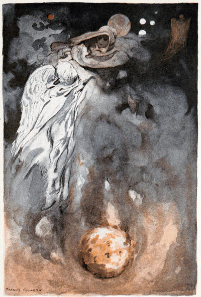 When Mother Nature had gone, Cold, who was the spirit of the great outer darkness in which the Sun and Stars move, hovered about the Earth and blew on it with all his might, and as his icy breath swept over the fiery Earth, the hot gases began to get cooler and cooler, and at last they turned back to liquids again. And[21] after that, they got cooler still and began to turn to solids, just as hot melted taffy gets hard and solid when it cools.
