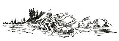 When the first stone house had been built, the little tribe built others, until there was room for all to sleep protected from the rain. Not knowing what wild animals, or even men, might live in the woods further back from the shore, they also built a stone wall across the neck of the plateau, so that on one side their camp was protected by the cliffs leading down to the ocean, and on the other, by this wall of stone. They brought great piles of firewood into the camp for cooking the fish they caught, and the waterfowl they shot with bows and arrows, along the shores of the little bay at the foot of the cliffs. Every day the men went out hunting and fishing in the canoe, sometimes on the ocean, when it was smooth, and at others, on the bay, or up the river which ran into it. They could not go up this river very far, because of the rocks in it, which made rapids, over which the boat could not pass. But they often went beyond the rapids on foot, and[249] brought back wild hogs, and many small furry animals they had never seen before, and sometimes bears and horned deer.