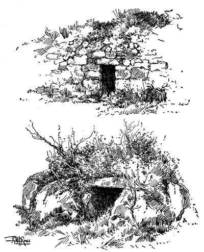 He picked out a great flat boulder near the stream, and he and his men dragged up other boulders, and arranged them in the form of a square. On these they placed more stones, choosing the flat ones, until they had built four walls, as high as their heads. In one of the walls they left a hole for a door, placing over its top a long, flat stone, to keep the wall above from falling down. The front wall they built higher than the back, so that the roof of the house would slant, to make the rain run off.