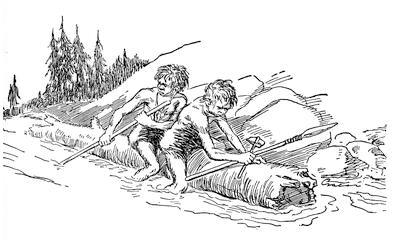 The attacking fleet was made up of many large log canoes, driven by both paddles and sails.[262] The hill men whom Ban had led to conquer the tribe by the sea knew little or nothing about making boats when they came, but the prisoners they had taken, women, and a few men, they made their slaves, and from these they learned how to make canoes of wicker and skins, and also how to burn them out of logs. As time went on Ban's tribe became great fishermen, just as the sea people had been before them, and travellers came down from the valley, bringing grain, and fine pottery, and many other new things that the sea people had known nothing about. This made the tribe of Ban very powerful and strong; from the slaves they had learned to make fish hooks, and nets, and grass cloth and boats, and from the hill people, and the dwellers in the valley, they learned how to make bread, and wine, and to plant things for food, and make clothing of leather and skins instead of grass cloth, and much besides. Soon all the country between the valley and the sea was covered with people, and now the new tribes that wandered away from the valley went inland, settling new country, for there was[263] no longer any room for them, in the direction of the sea.