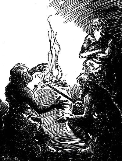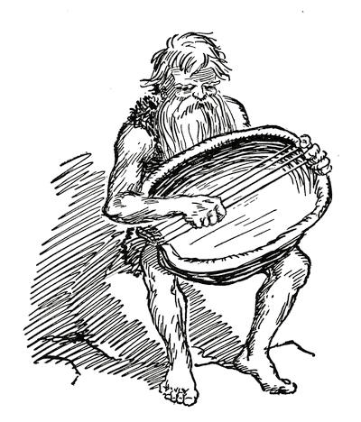 They ate the bread cakes, and drank the wine, which made them very merry and gay. The old men, who later on were called bards, made a song in honour of Modor's victory, and one of them played the first music that man had ever heard. He had taken the shell of a sea turtle, and stretched some thin strings of gut across it and he picked these strings with his fingers while singing his song. Many hundreds of years later these bards, with their rude harps, wandered all through the country, from village to village, entertaining the people around the fires at night with songs of the mighty deeds of Modor and other great chiefs and leaders of the past. In those days, before people had learned to write, these bards were the ones who kept the history of the past, and even to-day we can find some of their songs and stories in the ancient sagas and legends of almost every people and country. Some of the deeds of these ancient heroes as told by the bards were so wonderful that the people came to look upon them as gods.