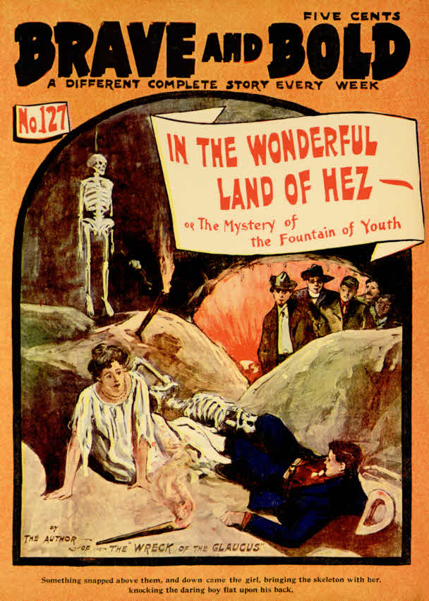 “There are a few questions I would like ter ask some of you fellows,” said Martin Haypole, a day or two after their arrival at Leo’s home. “First—who built the obelisk at the entrance of Hez? Second—was the legend of Hez true, and was Roderique de Amilo as old as he claimed? Third—was the pool and fountain in the dazzlingly lighted cavern really the Fountain of Youth Ponce de Leon was in search of? And, fourth—was it really the discharge of the cannon that caused the earthquake that wrought such a ruin upon the city of the Naztecs and the Land of Hez?”